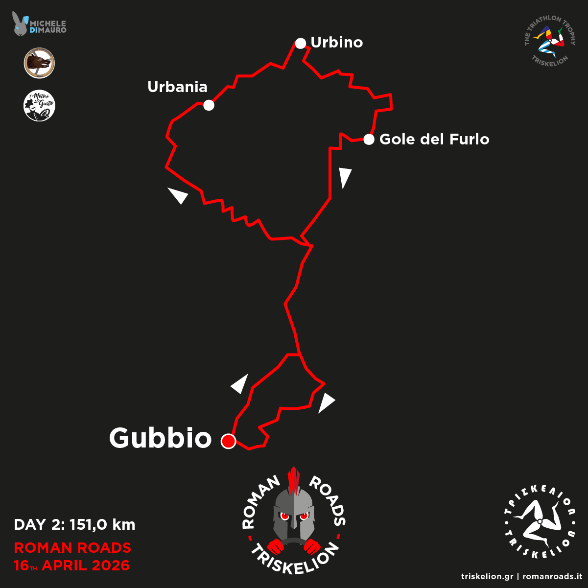 | Thursday | 16th Apr | Urbino | 14:30 | 55,00 km | Genga | 15:30 | Coffee stop |