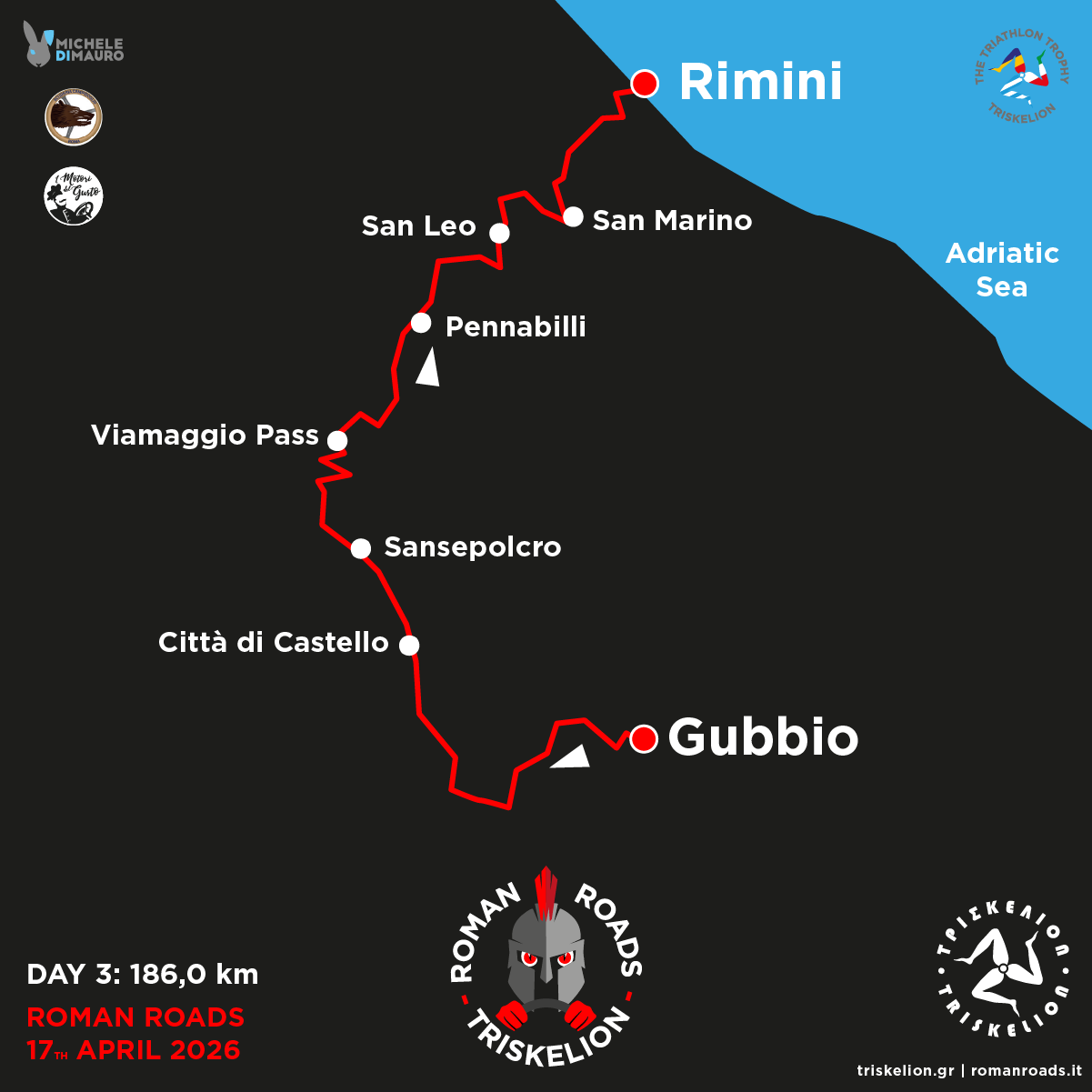 | Friday | 17th Apr | Passo di Viamaggio | 14:30 | 71,00 km | San Marino | 16:30 | Coffee stop |
